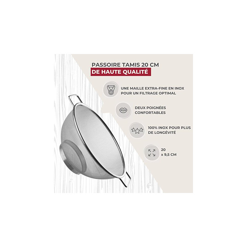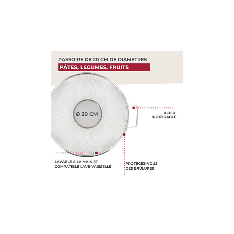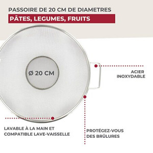 Fackelmann vous propose cette passoire tamis en inox avec des poignées pour égoutter vos aliments LE PETIT + : Vous pouvez utiliser notre passoire comme tamis lorsque vous souhaitez tamiser en grande quantité de la farine, du cacao, de la poudre d'amande, du sucre glace… COMPOSITION : Acier inoxydable DIMENSIONS : 20 x 9,5 cm CONTENU : 1 passoire tamis inox La passoire tamis de Fackelmann est pratique pour laver et égoutter les aliments comme les fruits et légumes, le quinoa, le riz, les pâtes etc. cette passoire a l'avantage de faire office de tamis ce qui vous permet de tamiser facilement la farine, le cacao, le sucre et sucre glace, la poudre d'amandes et tout autre type de poudre. Fackelmann France est une entreprise spécialisée dans la distribution d'ustensiles de cuisine et de pâtisserie ainsi que de moules à gâteaux et de plaques de cuisson. L'entreprise tente d'apporter une certaine facilité dans la façon de cuisiner de chacun grâce à ses ustensiles malins. Les ustensiles de cuisine de Fackelmann France sont proposés à tous les profils de cuisiniers pour une utilisation simple et quotidienne. Les fouets, spatules, louches, éplucheurs, planches à découper et bien d'autres sont à votre portée afin de préparer de délicieuses recettes toujours plus originales.